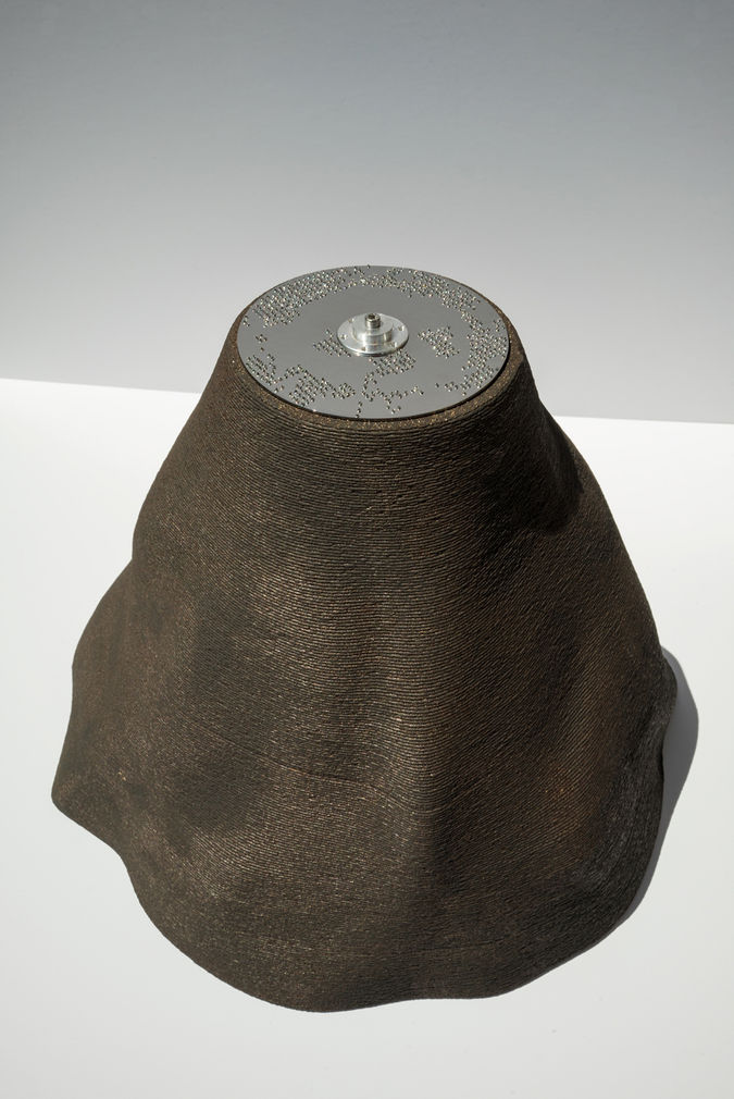 Lecteur optique de disques durs, tourne-data fait résonner la matière de ces objets emblématiques, supports d’archivage de nos mémoires personnelles. Perforés, comme les cartes des orgues de Barbarie, des métiers Jacquard et des machines analytiques ancêtres de l’ordinateur, ces disques hybrides affirment la matérialité des supports et questionnent leur obsolescence. Le code inscrit sur le disque est la transcription d’une image en code binaire. Tournant lentement au sommet d’un monticule de terre, une image de cartographie du sol devient* une séquence sonore qui se répète, à la recherche d’une polyphonie fréquentielle. Les sonorités produites sont des multiples de 432Hz.